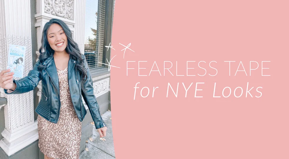 We collaborated with Tara Aman (@miss_tara_sun) and Katie Stuart (@wanderabode) for these glittering New Year’s Eve looks. For this post, we wanted to show you two easy ways to keep your look together until the new year hits. Whether you're dancing the night away or snacking in a cute dress with your family until the ball drops, Fearless Tape is here for you.
